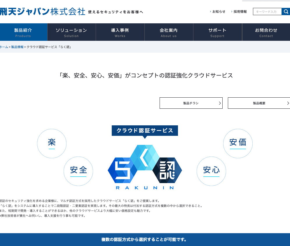 飛天ジャパン株式会社のらく認は、3アカウントまで無料で試せるワンタイムパスワードサービスです。メールやアプリを使用したソフトウェアトークンの他、別途トークンを購入してハードウェアトークンも使用可能。クラウドなので導入コストが低く、有料プランも安価で利用できます。