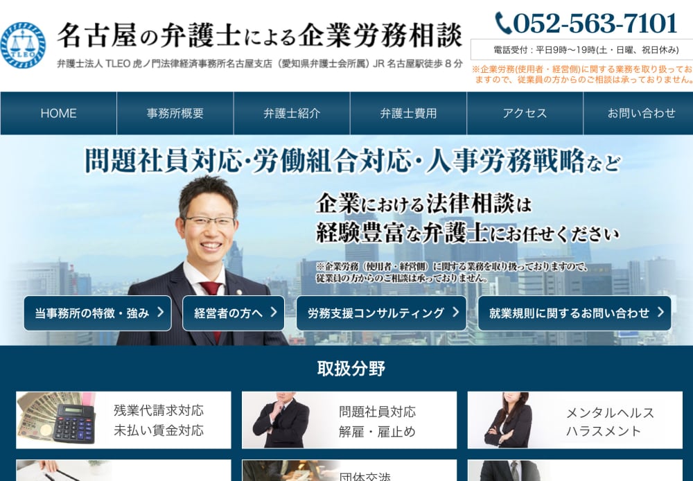 弁護士法人TLEO虎ノ門法律経済事務所名古屋支店は経営労務や中小企業法務を専門に行う事務所です。従業員の採用から退職までのリスク予防をはじめ、賃金制度を含めた雇用環境整備への助言等、経営側の労務顧問サービスを提供。起きてしまった労働問題や様々なトラブルの解決に向け適切にサポートします。
