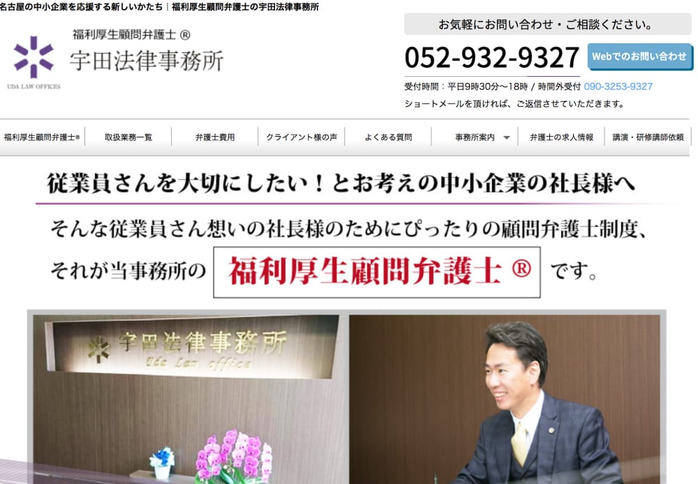 宇田法律事務所は中小企業向けのリーガルサービスを提供する事務所です。従業員からの相談に幅広く対応する福利厚生顧問弁護士制度を提供。労働に関する相談だけでなく、プライベートな悩みにも対応し、従業員のモチベーションアップをサポートします。