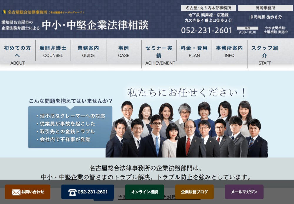弁護士法人名古屋総合法律事務所は中小企業のトラブル解決や紛争防止に取り組む事務所です。クレーマーやネットの誹謗中傷、労災事故や会社の不祥事まで、中小企業が抱える様々な問題をスムーズに解決します。