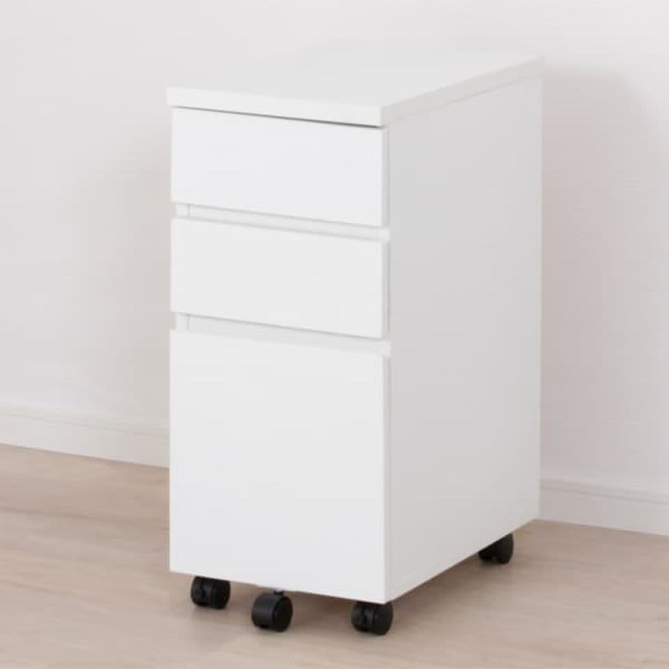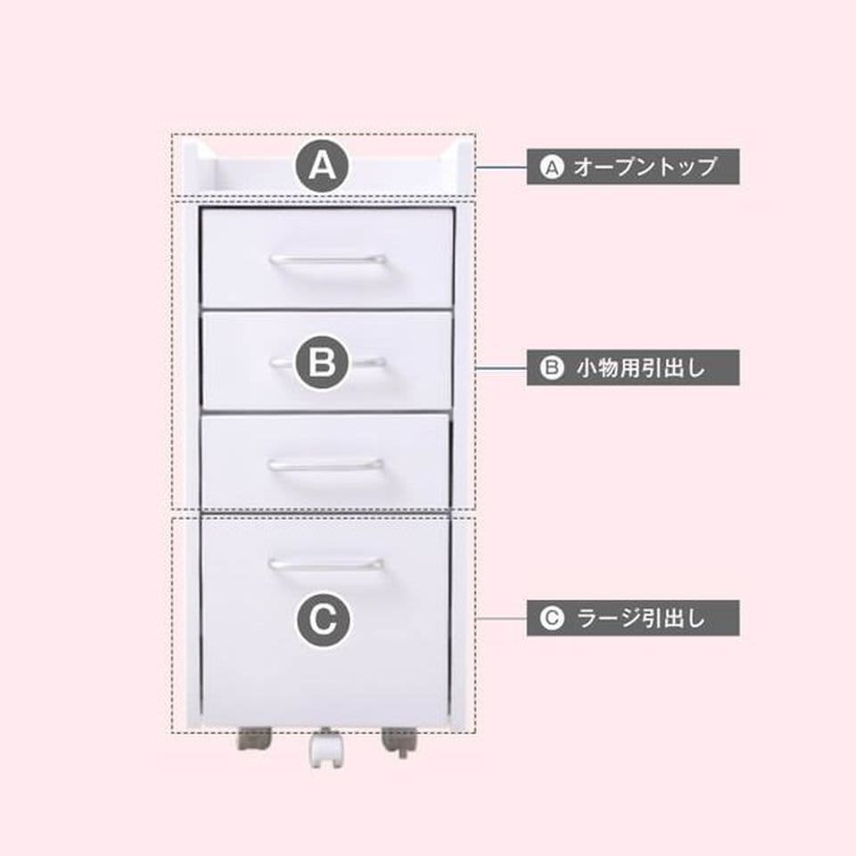 どんな場所にも設置しやすいスリム幅34cmのオフィスワゴンです。オープントップに小物用の引き出しが3つ、下段のラージ引き出しはスライドレールがついていてスムーズに引き出せるだけでなく深さも十分あり、安定性抜群のポイントキャスター装備でオフィス用にもおすすめ。