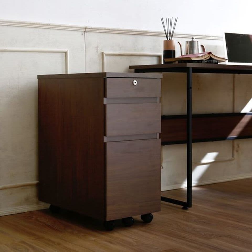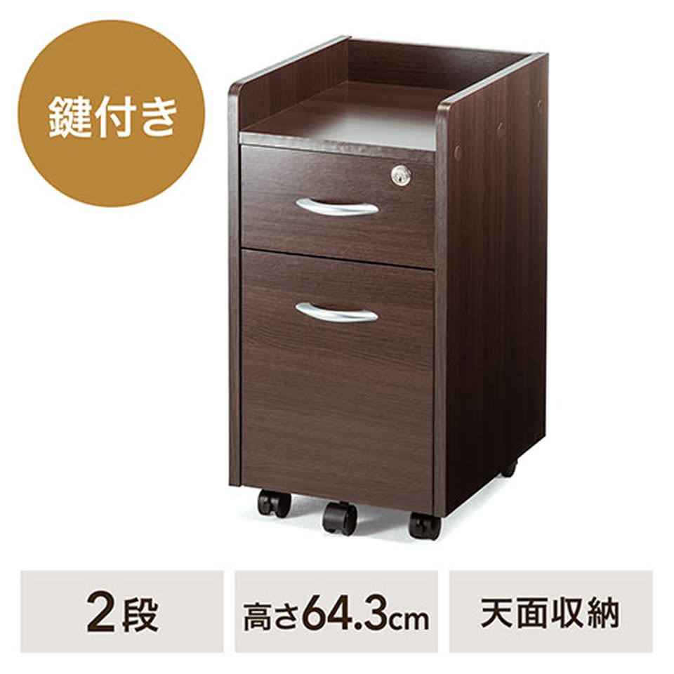 高級感のあるブラウン色の木製オフィスワゴンです。引き出しは2段、天板部分には丸角加工された縁が付いていて収納できるので狭いスペースも有効活用が可能。上側の引き出しは鍵付きで重要書類や小物の収納に便利です。キャスター付きで移動もしやすく、キャスターにはロックもついていて安定感も抜群。高級感のあるブラウン色の木製オフィスワゴンです。引き出しは2段、天板部分には丸角加工された縁が付いていて収納できるので狭いスペースも有効活用が可能。上側の引き出しは鍵付きで重要書類や小物の収納に便利です。キャスター付きで移動もしやすく、キャスターにはロックもついていて安定感も抜群。