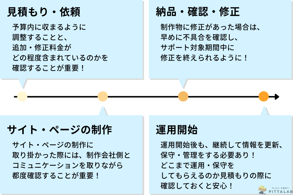 サイト・ページの制作に取り掛かった際には、発注者側と制作会社側でコミュニケーションを取りながら都度確認することが重要です。