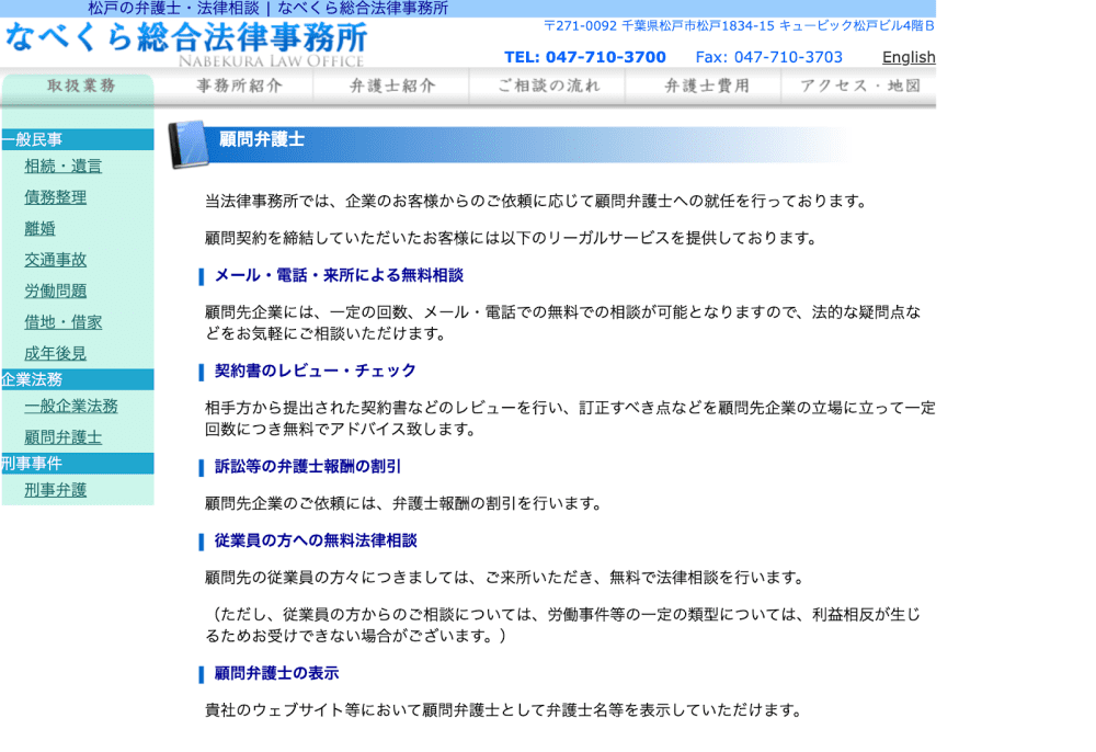 松戸・柏エリアをメインに、一般民事や企業法務を扱う弁護士法人なべくら総合法律事務所。法律用語には難解な言葉や概念も多いですが、できるだけ平易な言葉を使い、相談者に正確に理解してもらえるよう努めているため、法律について知見が少ない方でも気軽にご相談をすることができます。