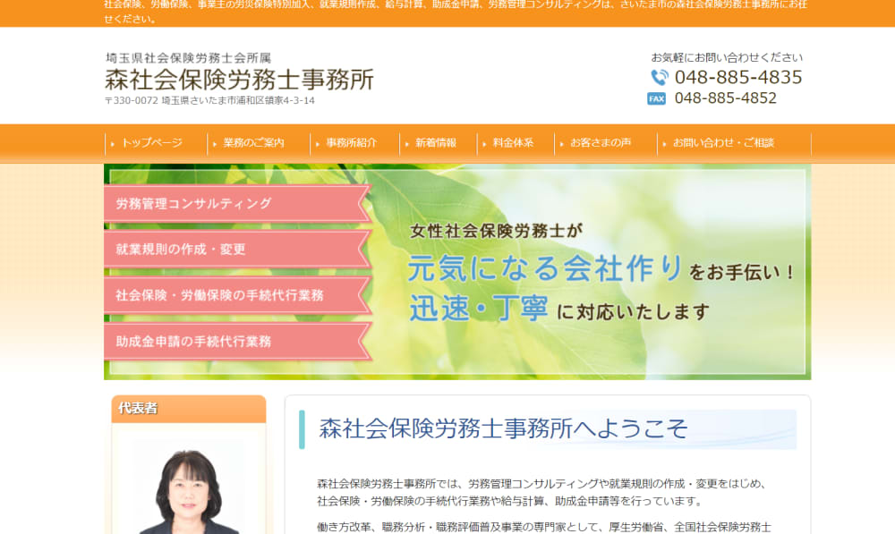 森社会保険労務士事務所では、女性社会保険労務士が元気になる会社作りをサポートします。初回のみ15分程度の電話による無料相談を実施しており、気軽に問い合わせ可能。労務管理コンサルティングや就業規則の作成・変更をはじめ、社会保険・労働保険の手続き代行業務や給与計算、助成金申請などを行っています。