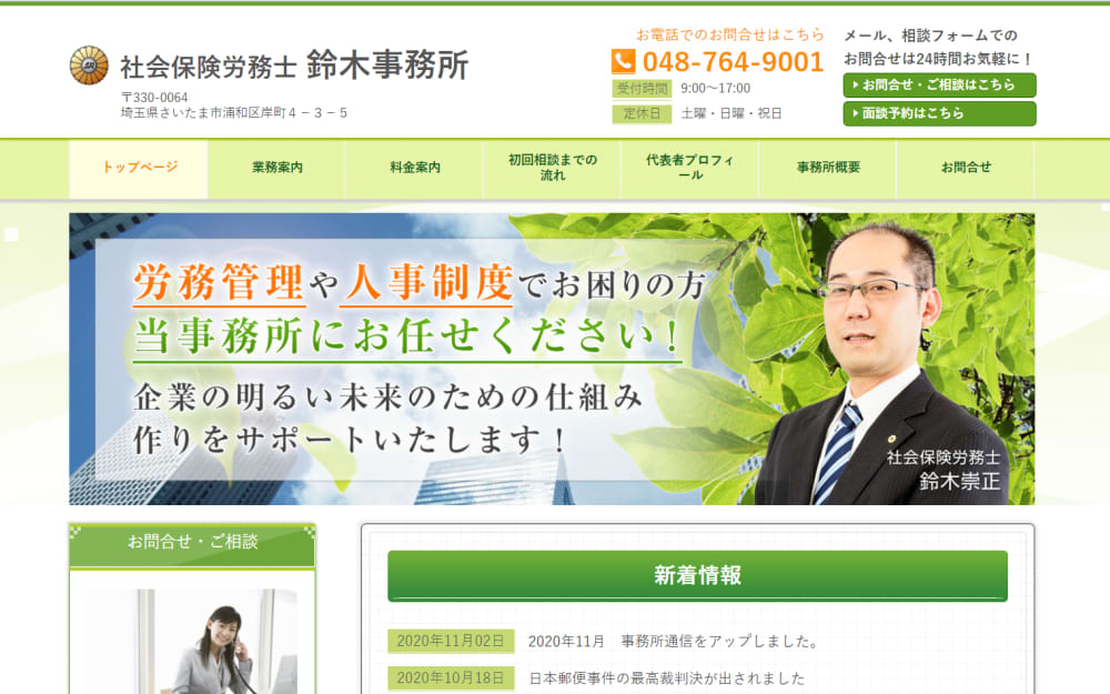 社会保険労務士 鈴木事務所は、企業の明るい未来のための仕組み作りをサポートする会社です。法律相談・労務相談以外にも被保険者資格の得喪・事業所関係の届出・労災保険給付の請求などに対応。顧問サービスを依頼することで、電話による質問対応・24時間メールサポート・年2回の訪問を通し、課題の解決とビジネスの成長をサポートが受けられます。