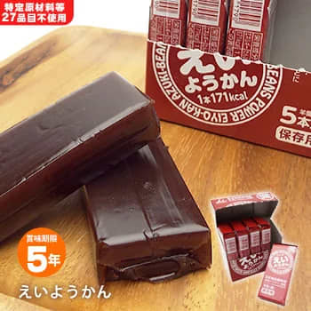手軽にカロリー補給ができるえいようかん。5年間の長期保存もできるため、防災非常食にぴったりといえます。1本1本を気密性の高いフィルムでパックしているので、安心です。やわらかくなめらかな食感なので、小さい子供まら年配の方まで食べられるのも魅力。
