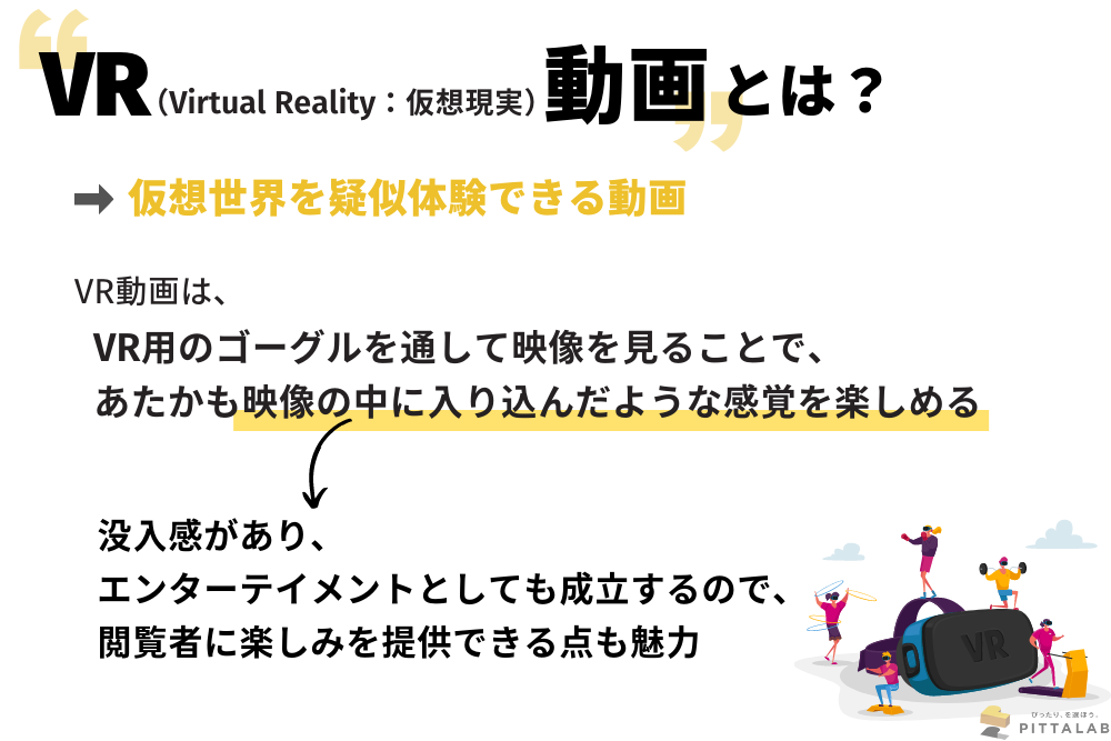 VRとは、仮想現実を意味するVirtual Reality(バーチャルリアリティ)の略語で、仮想世界を疑似体験できる動画がVR動画です。