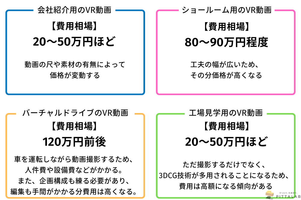 それぞれ具体的な相場を説明するので、VR動画の目的に合致するパターンの相場を確認しておきましょう。