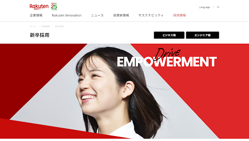 楽天グループ株式会社の採用サイトは、企業カラーの赤と白で構成されたパッと見で「楽天グループのサイト」と分かるデザインが印象的です。企業イメージを全面に出したデザインを制作したい方へ、参考事例としてオススメできる採用サイトです。