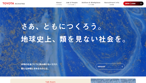 トヨタ自動車株式会社の採用サイトは、運営するメディアと動画を駆使した、メッセージが伝わりやすいデザインになっています。シンプルですが目を引くデザインが参考になります。