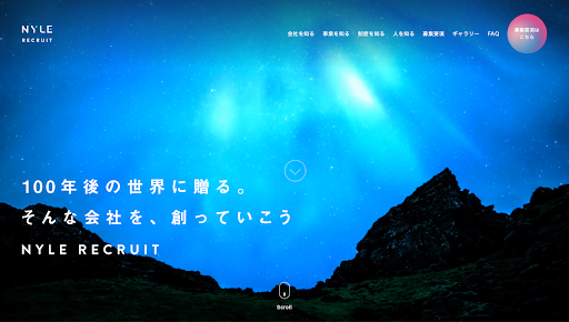 トップページの動くオーロラが特徴的なナイル株式会社の採用サイトです。募集要項ボタンも鮮やかなグラデーションでデザインされていたり、カラーの切り替えが自動的に行われたりとまとまりのあるデザインが魅力的です。