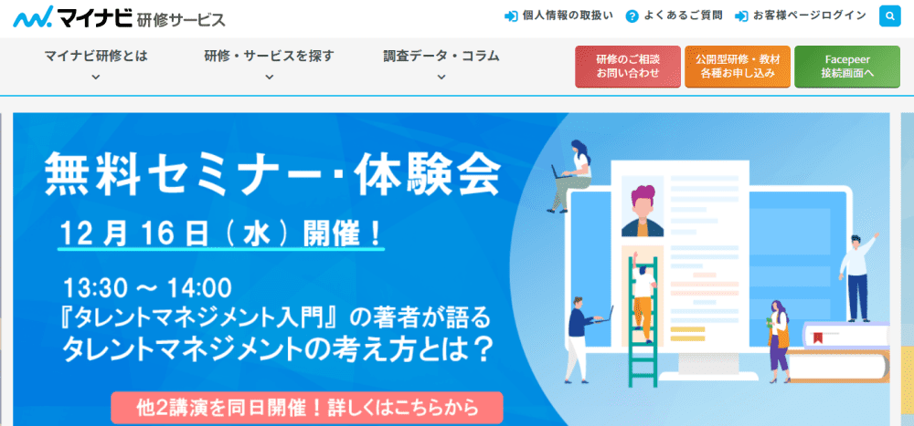 定番の新人研修だけでなく、リーダーシップ研修や役員研修など、様々な層に向けた研修も数多くあります。